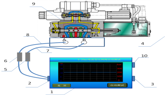 If manual testing is normal, automatic testing will follow up. This intelligent tester may output the necessary signal automatically and collect the displacement signal of valve core and oil pressure of A & B points of hydraulic control valve as well to display the result in form of curve on screen.