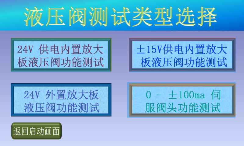3、確認現(xiàn)場人員和設(shè)備安全后,點擊“進入測試”,進入液壓閥測試類型選擇畫面;